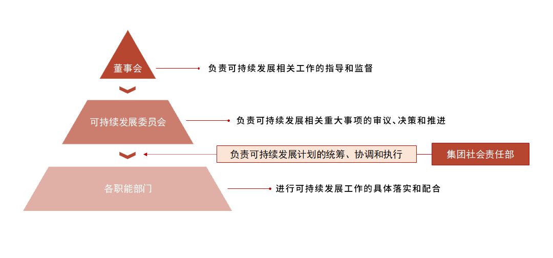 凯发天生一触即发相信,科学高效的治理架构是推动企业可持续发展建设的基石。2021 年凯发天生一触即发成立了独立的企业社会责任(简称“CSR”)部门,为进一步推动企业的可持续发展,2022 年 1 月 17 日凯发天生一触即发成立了企业社会责任委员会,并在2023年初升级为可持续发展委员会。委员会将作为上市公司的战略决策机构, 由凯发天生一触即发董事长王佶担任名誉主席、总裁谢斐担任主席,各职能高层为主要成员,从组织架构上保障了今后可持续发展事务运作的有效推进。